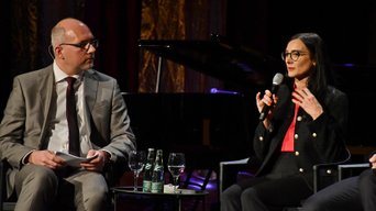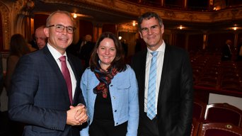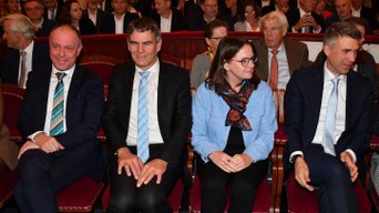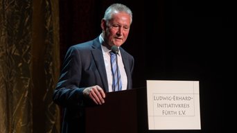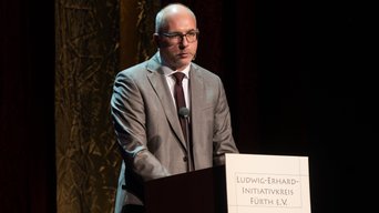 Auch Fürths Oberbürgermeister Thomas Jung bezog sich in seinem Grußwort auf den großen Sohn der Stadt. „Maß halten“, wie es Ludwig Erhard einforderte, müsse wieder im Zentrum der Politik stehen. Während Fürth dies seit Jahren beherzige, so Jung, bereite es ihm Sorge, dass auf anderen politischen Ebenen viele neue Schulden gemacht werden. „Ludwig Erhard würde sich darüber nicht freuen.“ Zuvor hatte bereits Evi Kurz, die Vorsitzende des Ludwig-Erhard-Initiativkreises, ähnlich argumentiert. Um Erhards Soziale Marktwirtschaft zu erhalten seien wichtige Reformen des Sozialstaats von Nöten. „Der Standort Deutschland ist schlicht zu teuer und vor allem überreguliert“, so Kurz. Unternehmen wanderten vermehrt ab, wenngleich keiner gerne gehe. „Wir müssen wieder innovativer werden und ein Land der Spitzenforschung“, fordert sie.