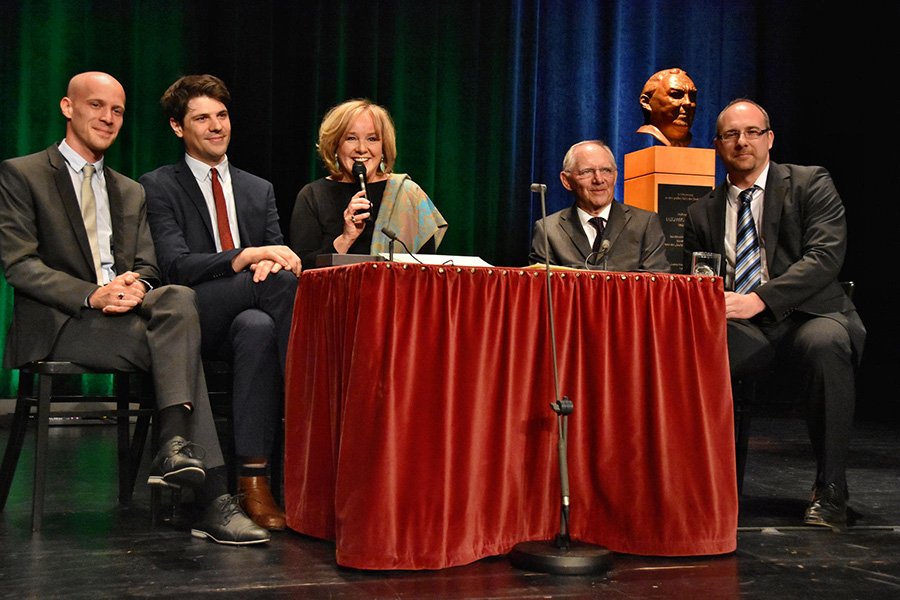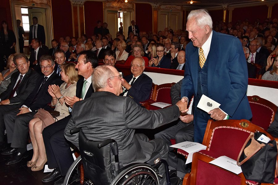 Festredner Wolfgang Schäuble setzte sich in seinem Vortrag vor allem mit Ludwig Erhards Erbe, der Ordnungspolitik, auseinander und was man daraus im 21. Jahrhundert lernen kann. „Erhards Lehren gelten auch und gerade für unsere Zeit“, so Schäuble, der den ehemaligen Bundeswirtschaftsminister und Bundeskanzler noch als junger Abgeordneter im Bundestag persönlich kennen lernte. Seit 2009 – und da schloss sich der Kreis zum heutigen Preisträger Stefan Hähnel – habe die Ordnungspolitik eine neue Wertschätzung erhalten. „Ludwig Erhard hat oft gesagt, Wirtschaftspolitik sei mindestens 50 Prozent Psychologie. Und mit seiner Zigarre war er ein lebendes Symbol des Optimismus.“